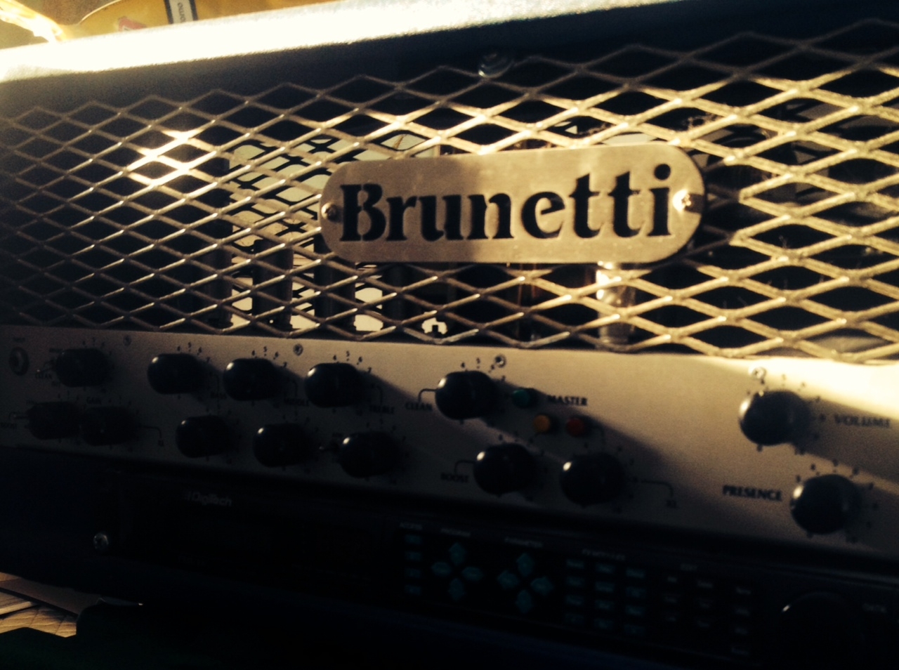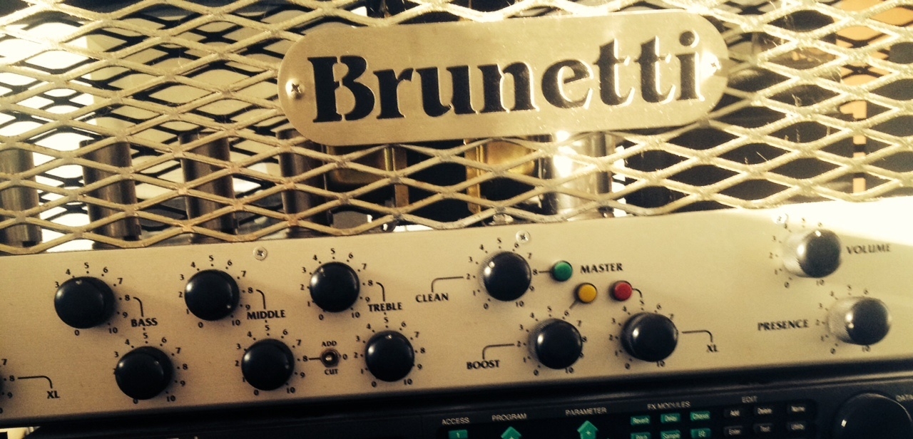 La testata Brunetti Stereo 120 Kt88 è un prodotto molto particolare realizzato dal mio amico Marco Brunetti che monta un doppio stadio di finale a valvole proveniente dal suo Van Der Graff degli anni 90’. Queste caratteristiche gli consentono di riprodurre un suono decisamente cattivo e graffiante.